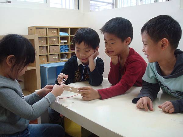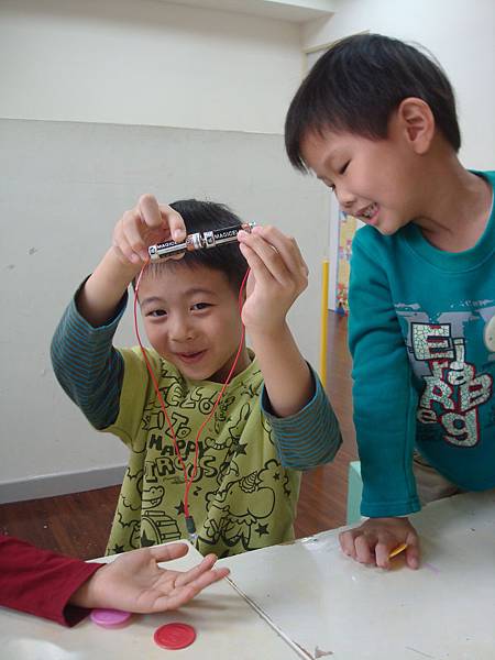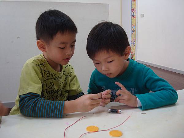 整個過程中,孩子們幾乎沒有搞笑、分心;而是一直很認真、很認真的看著電池跟燈泡。